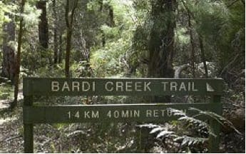 The Bardi Creek Trail leaves from the back of the Northcliffe Pioneer Museum in the center of town. Follow the trail for 700m into Northcliffe Forest Park and you will find the enchanted Arcadia picnic spot in the middle of the forest. This trail is also part of the Bibbulmun Track. The walk takes you through coastal swamp vegetation, and will take you back to town. In winter, take care as you use the stepping stones to cross Bardi Creek, and in summer watch for flashes of colour from the bright red bottlebrush.
