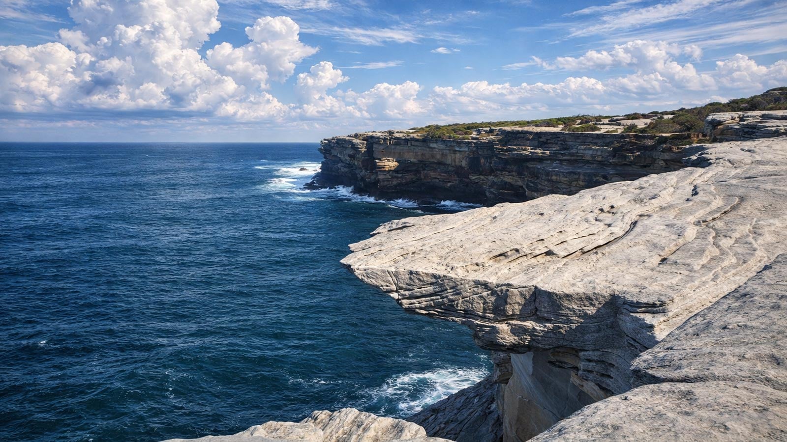 The walk begins at the end of Cape Solander Drive near the lookout, beside the prominent track sign and toilet facilities. From here, the path follows the cliff line south, marked by green poles and etched into sandstone. The ocean remains a constant presence, and it is important to stay well back from the fragile cliff edges. This opening section moves across exposed rock and through low heath, offering a raw, windswept feel that is typical of this stretch of coast.
