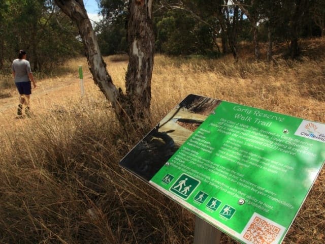 An artistic interpretive sign is situated at the start of the Carty Reserve. The walk itself follows the creek line. It would be best to do this walk in Winter and Spring when the creek is running and the flowers are blooming. The area has been revegetated with local native species.