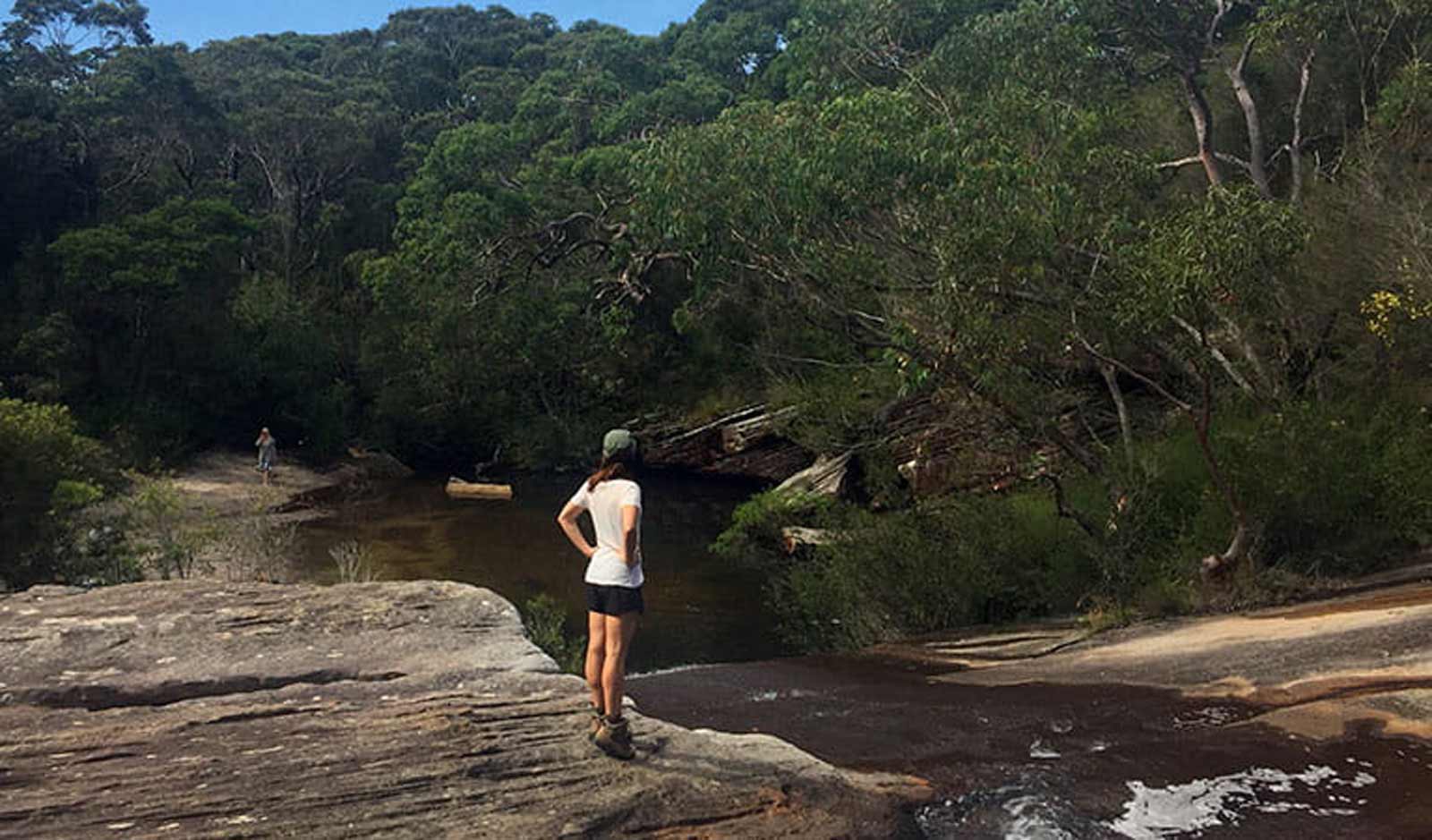 The trail continues past an old concrete pipe (often marked with white arrows) and winds down the hill along narrow pathways and over a few rock platforms. As you near Deer Pools, there'll be a clearing on your left as the track bends towards the waterfall. The path then leads over the top of the falls to another clearing on the other side.