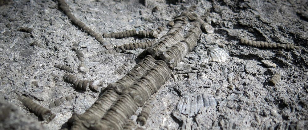 On the lower rock shelf you can see a variety of fossils including sea fans, coral-like creatures, scallop shells and sea lilies.