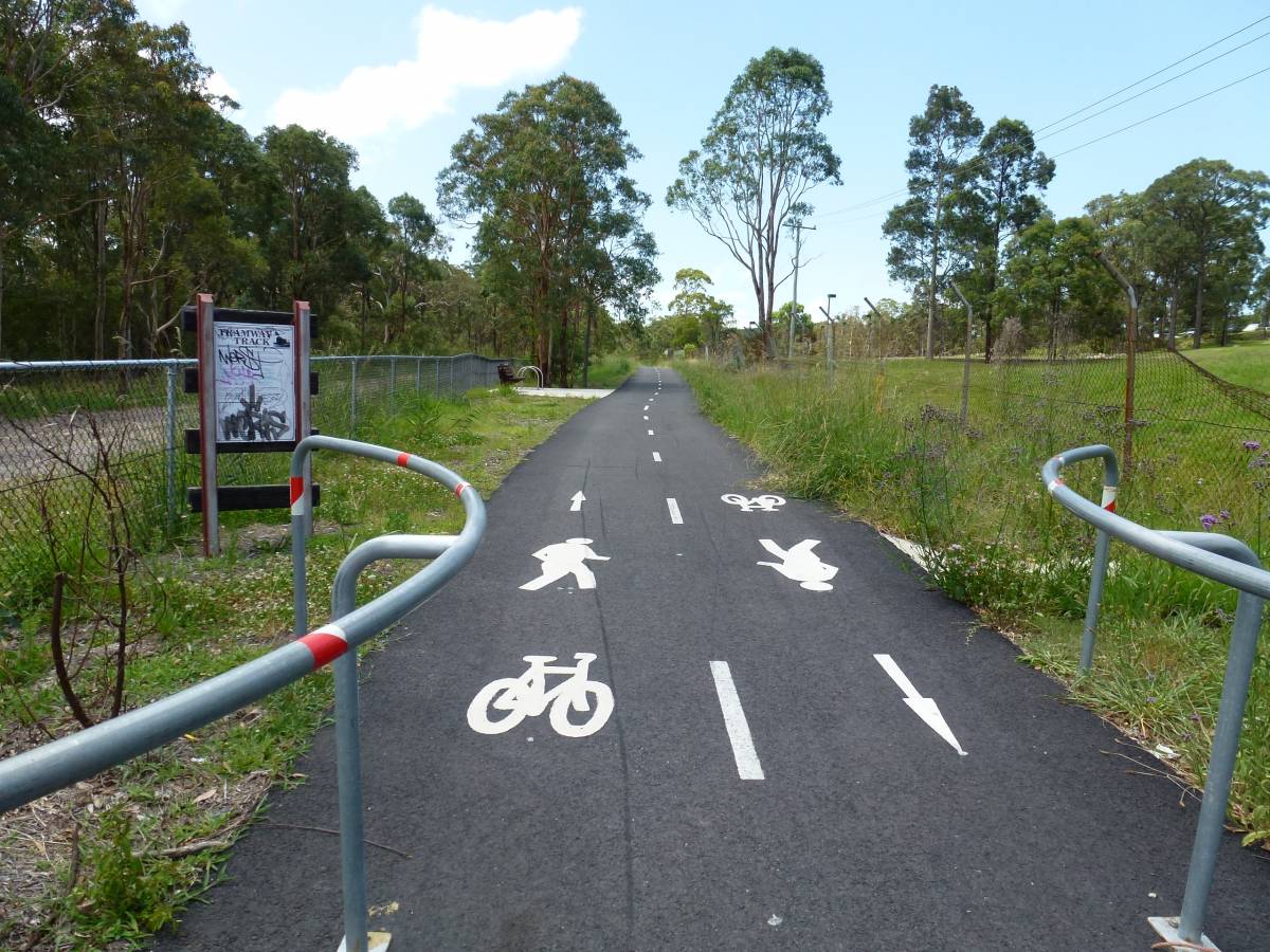 This section is basically flat and passes two suburban shopping centres. It following the line of both disused colliery rail lines and the tramway. It runs along a suburban St before crossing busy Newcastle Rd at Traffic lights