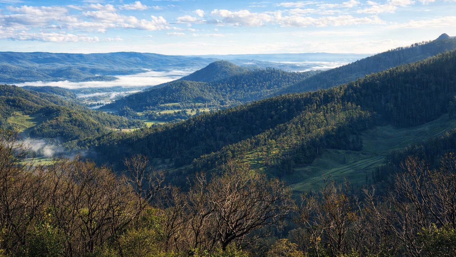 At The Crossways, turn left and head north along Boundary Trail. After a short distance, look for Panorama Trail on the right. Pass the first junction, continue for about 250 metres, then turn left onto the second entrance to Panorama Trail. This short side loop is worth the effort, leading to Panorama Lookout at its easternmost point, where views open out across the surrounding forested hills.