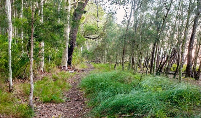 The track begins at the Meroo Head carpark and winds through towering old-growth forest to the edge of the lake. The area is ideal for birdwatching, with swans, musk ducks, pelicans, and cormorants frequently seen around the lake.