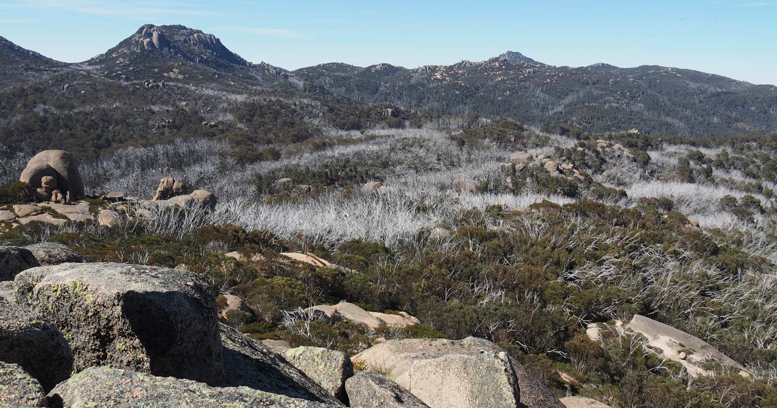 The short side trip to these peaks involves a scramble through scattered boulders, offering a chance to weave between ancient stone forms shaped by millennia of weathering. From the higher points, you’re treated to expansive views across the Buffalo plateau—windswept, quiet, and seemingly untouched. This is a spot where it's worth pausing for a while, not only for the scenery but for the atmosphere—where the scent of alpine vegetation hangs in the air and the silence is broken only by the breeze or the occasional call of a currawong.