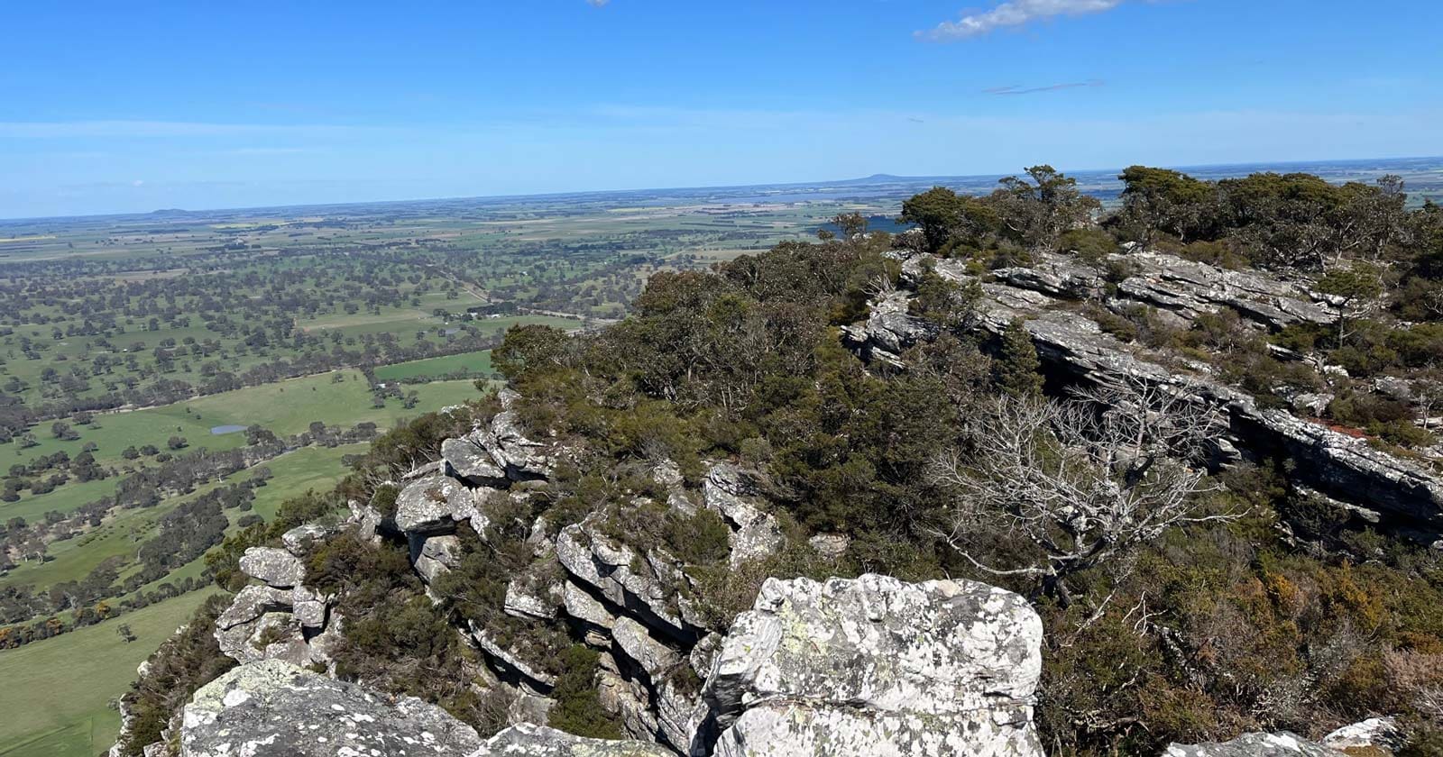 Near the summit the terrain becomes steeper and more exposed as the path works its way through rock and sparse vegetation. Reaching the top of Mount Sturgeon, known to Traditional Owners as Wurgarri, rewards the effort with wide views across the surrounding landscape. From here you can see the rugged sandstone ranges of Gariwerd stretching northward, while to the south the land falls away to the volcanic plains around Dunkeld. These contrasting landscapes tell a long geological story. Basalt lava flows spread across the plains thousands of years ago, and nearby volcanic systems such as Budj Bim and Mount Gambier are believed to have been active only about 5000 years ago.