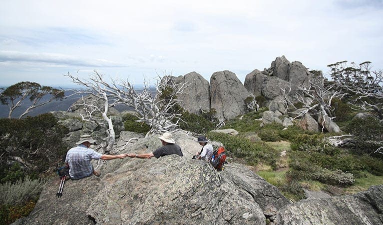 Continue straight at the junctions with Link track and Wheatley Link track and follow the Porcupine walk signs uphill to a broad gap. You'll be treated to panoramic views of the Main Range. The track bends left and scrambles over rocks to reach the large outcrop of granite boulders on the ridge, known as Porcupine Rocks. From here, you can enjoy spectacular views to Thredbo River Valley and Bullocks Flat below and back to Perisher and the Main Range.