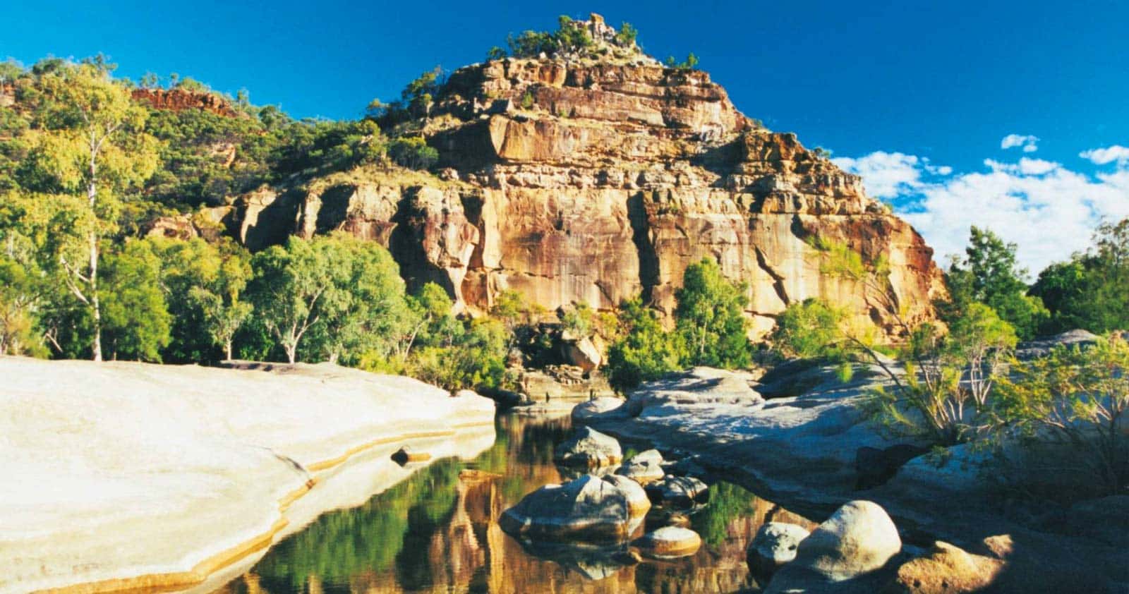 Towering cliffs of coloured sandstone, pockets of vine forest and deep permanent waterholes along Porcupine Creek contrast strikingly with the savanna plains surrounding Porcupine Gorge. The gorge lookout is about 60km north of Hughenden. The Pyramid camping and day-use areas and the Pyramid track are another 11km further north. The Yirendali Aboriginal people welcome you to their traditional country and ask that you respect their special place.