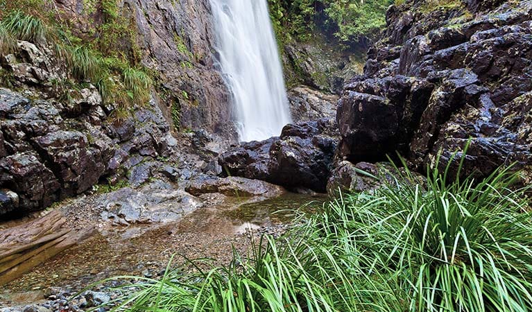 Starting at Never Never picnic area, follow Rosewood Creek walking track for 2km to the turn-off. Descending steeply for 1.2km, you'll see towering red cedars and bangalow palms. The water plunges over the escarpment creating a mighty roar and a fine spray of mist. The scene is breathtaking.