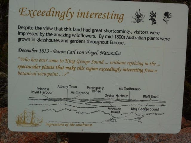 This short 500 metre walk provides a scenic circuit with 360 degree views of Torndirrup National Park and the Albany area. The path is part of the Western Australian Heritage Trails network. Interpretive plaques along the trail describe some of the thoughts of the first settlers to this area. There are magnificent views of Albany, King George Sound, Eclipse Island, West Cape Howe National Park and the Porongurup and Stirling Range national parks. The heritage trail begins at the steps on the southern side of the Car Park. The heathland along this walk comes alive in wildflower season and there are regularly large flocks of black cockatoos, especially when the heathland is in flower.