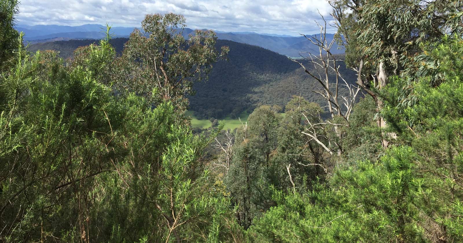 The walk begins just outside the township of Ovens, where you’ll join Nine Mile Track from Selzers Lane, near a cluster of hydroponic sheds. Though the track initially seems to pass through private land, it’s a public access road. As is always the case when walking near farmland, leave gates as you find them. The trail heads south, then curves southeast along an old fire road that climbs steadily through foothill forest. Early on, the wide track leads you gently upwards, gaining roughly 300 metres of elevation over the first four kilometres. The surrounding ridgeline gradually narrows, and you’ll find yourself walking between two valleys—Buffalo Valley stretching out to your left and the Ovens Valley unfolding on your right.